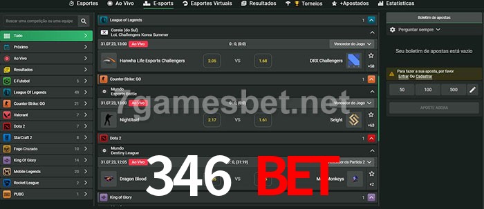 O 346 Bet oferece uma grande seleção de opções de apostas em e-sports com probabilidades competitivas
